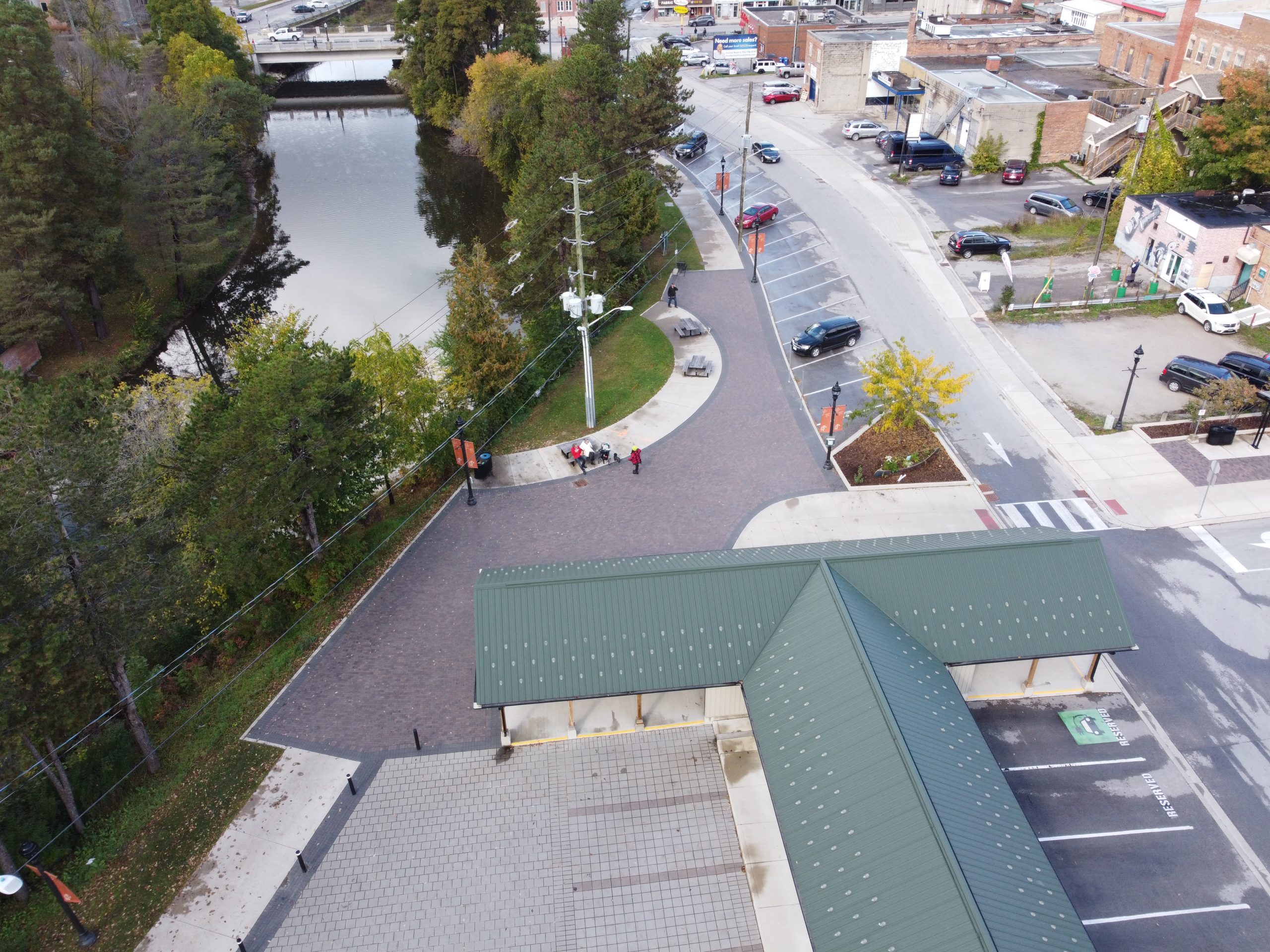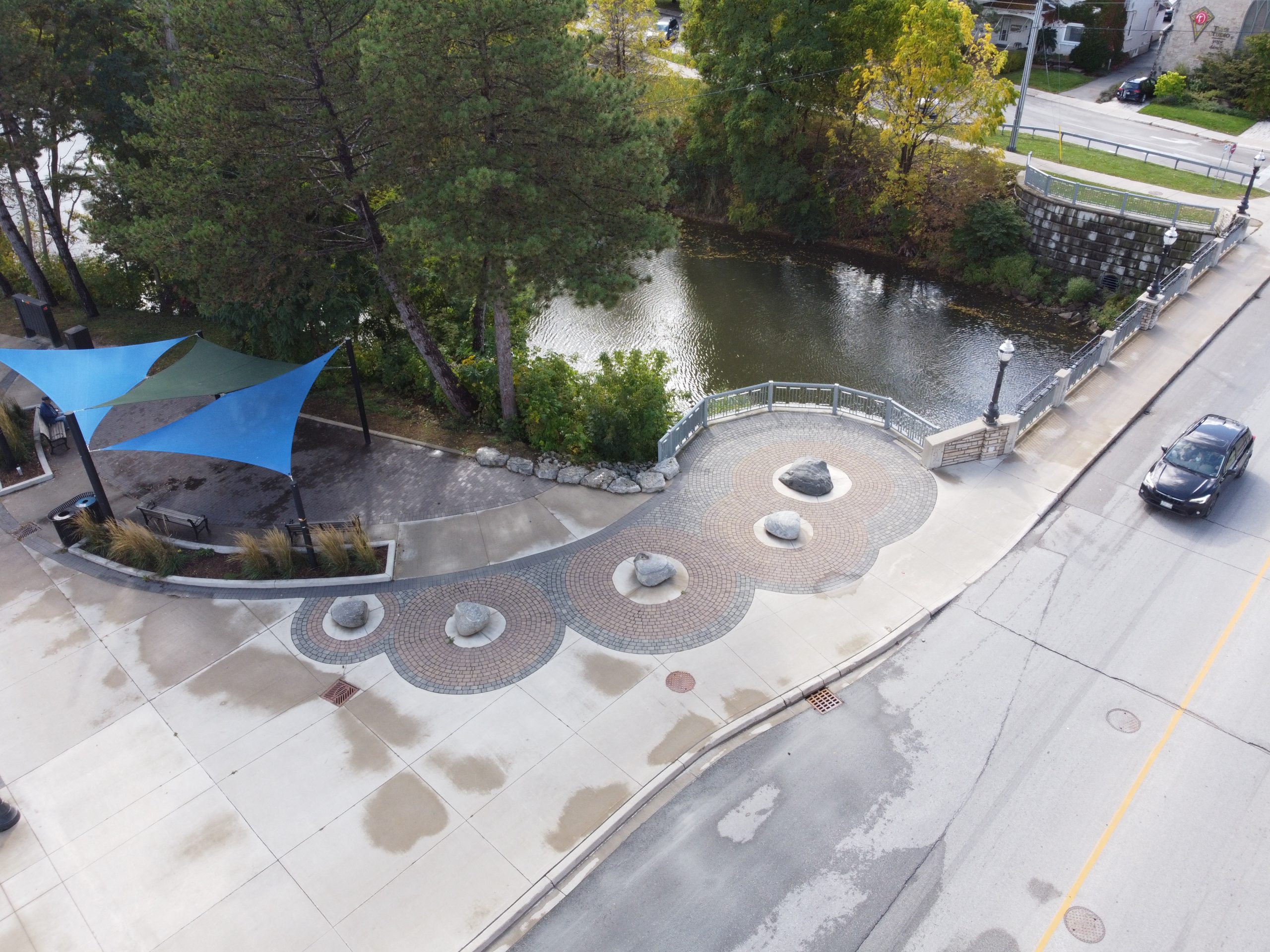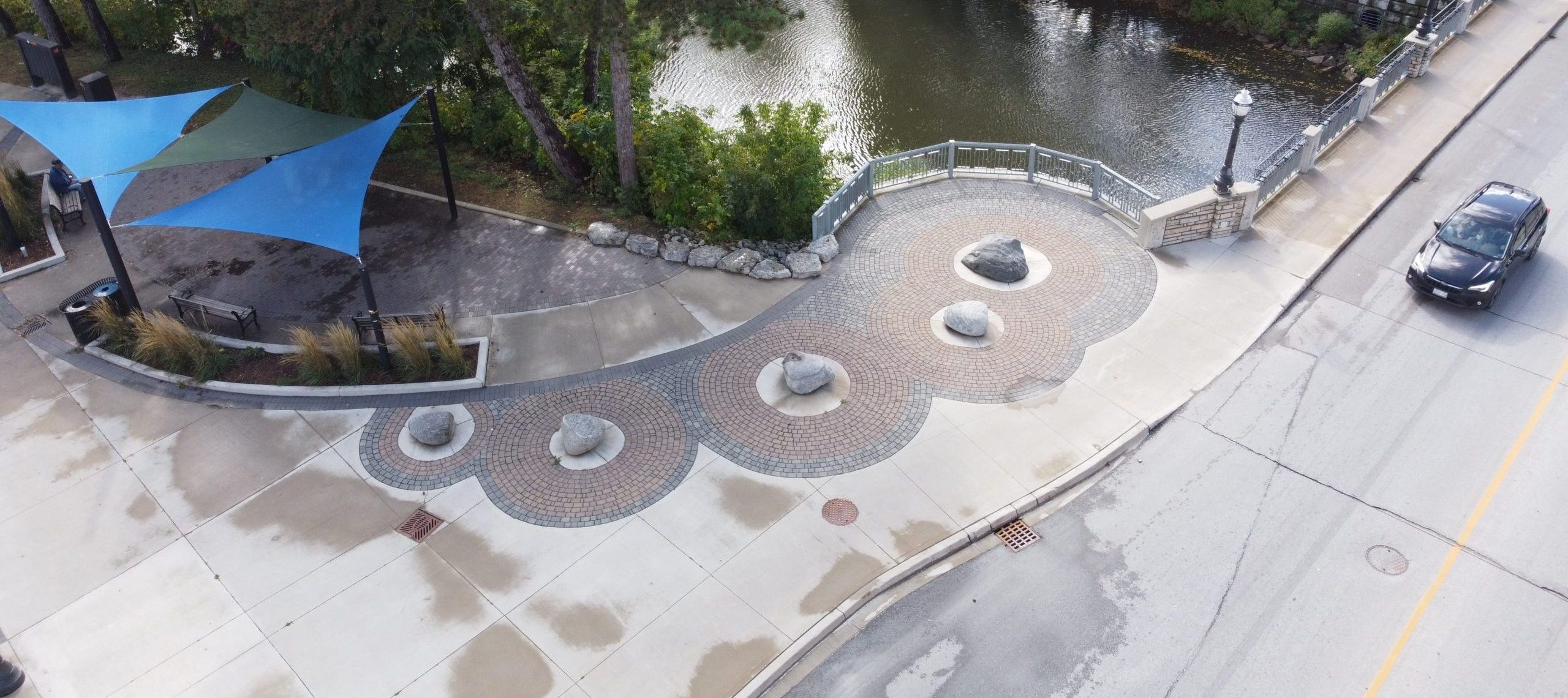 Phase 1, completed in 2019, reimagined the riverside urban block surrounding City Hall and the historic Farmers’ Market. With the realignment of 1st Avenue E., a flexible urban square was introduced to support the market, community events, and off-hour parking. Percy England Lane was extended to the river, creating a pedestrian corridor between Owen Sound’s main street and the waterfront. A shaded public gathering space was also created as a venue for informal use and public art.